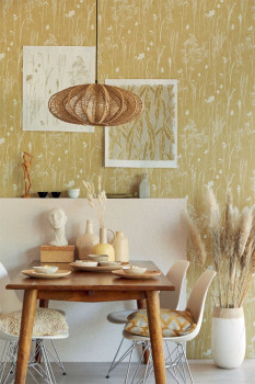 Vliesová tapeta s jemně plastickým povrchem, design lučních rostlin na okrovém podkladu.