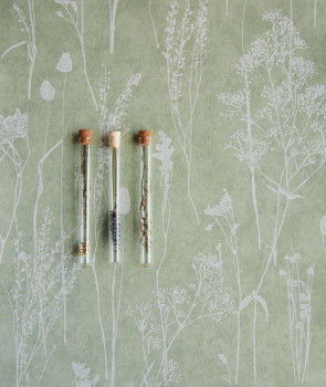 Vliesová tapeta s jemně plastickým povrchem, design lučních rostlin v šedo-bílých odstínech na šedo-zeleném podkladu.