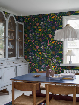 Vliesová tapeta na zeď, temně modrý podklad, motivy květin a listů v odstínech zelené, modré, růžové a fialové.