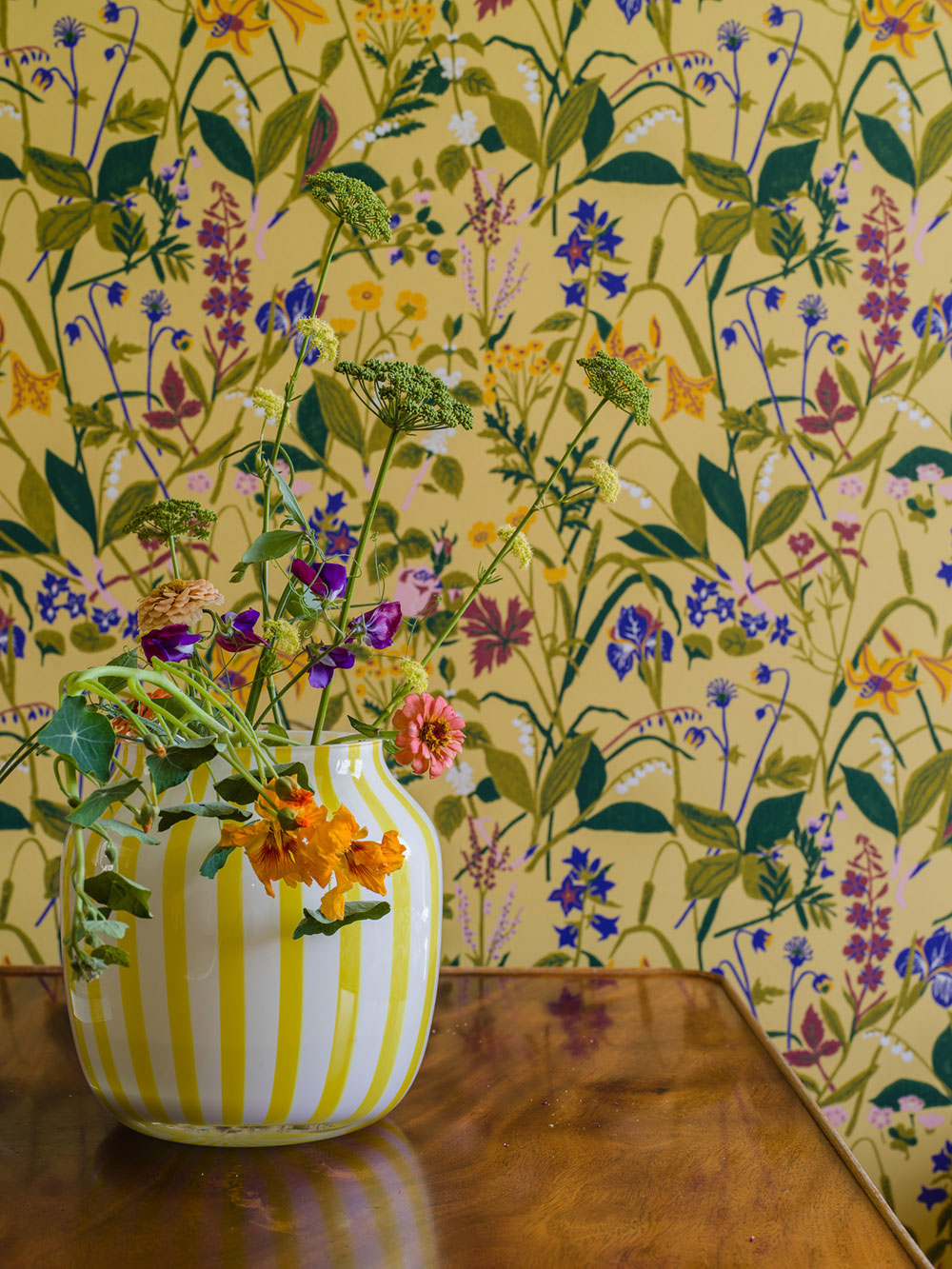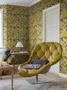 Vliesová tapeta na zeď, žlutý podklad, pestrý květinový vzor v odstínech zelené, modré, oranžové, vínové a růžové.