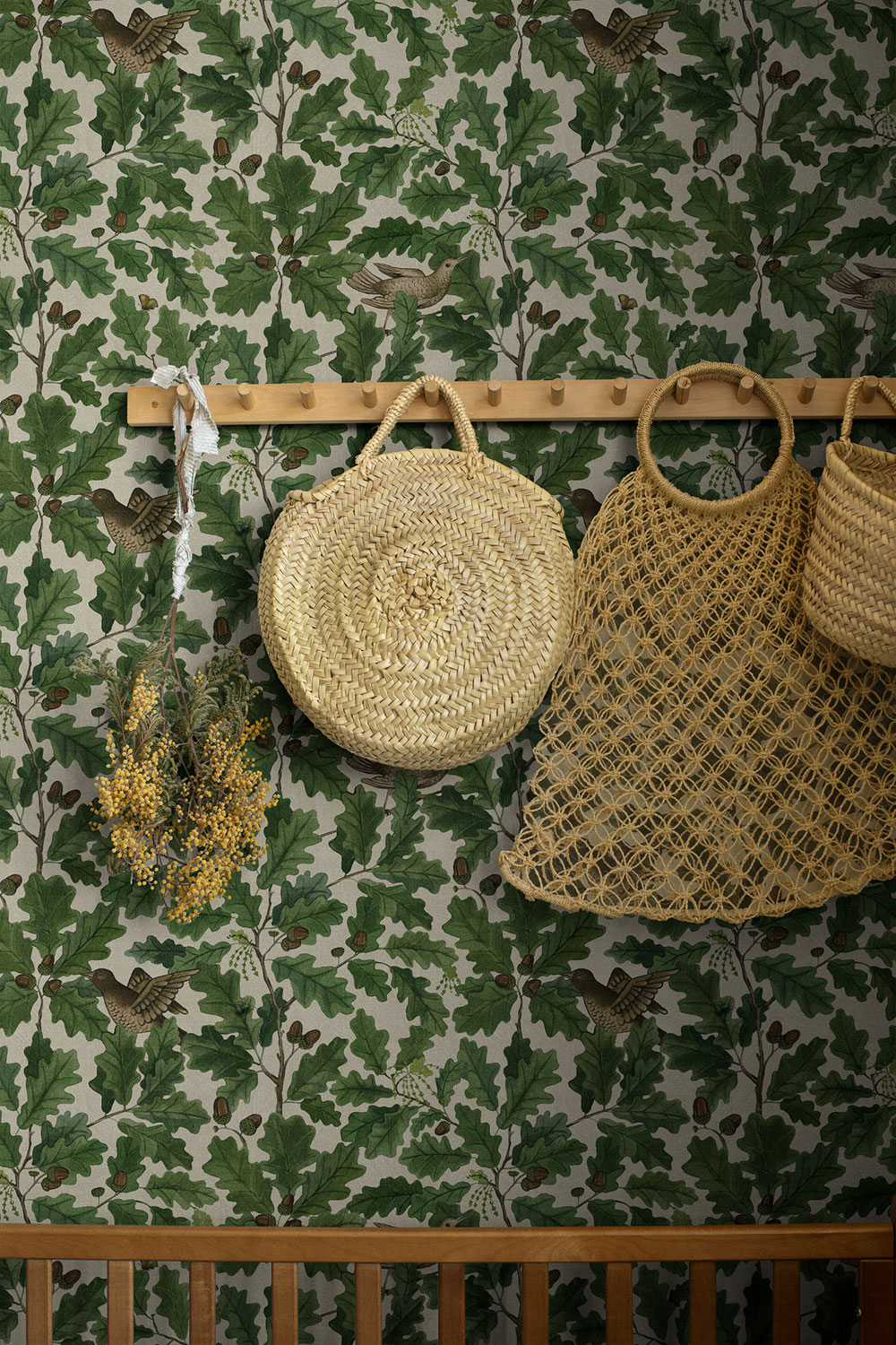 Vliesová tapeta na zeď „V dubu“ na béžovém lněném pozadí, které kontrastuje s tmavě zelenými a hnědými tóny vzoru flóry a fauny, je moderní interpretací středověkých tapiserií a vzorů Arts and Crafts.