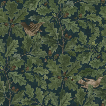 Vliesová tapeta na zeď „V dubu“ na půlnočním modrém pozadí se svěžím tmavě zeleným designem vnáší do prostoru svěžího a živého ducha - akvarelový vzor dubových listů, jemných žaludů a křehkých ptáků přináší do vašeho domova krásy lesa.