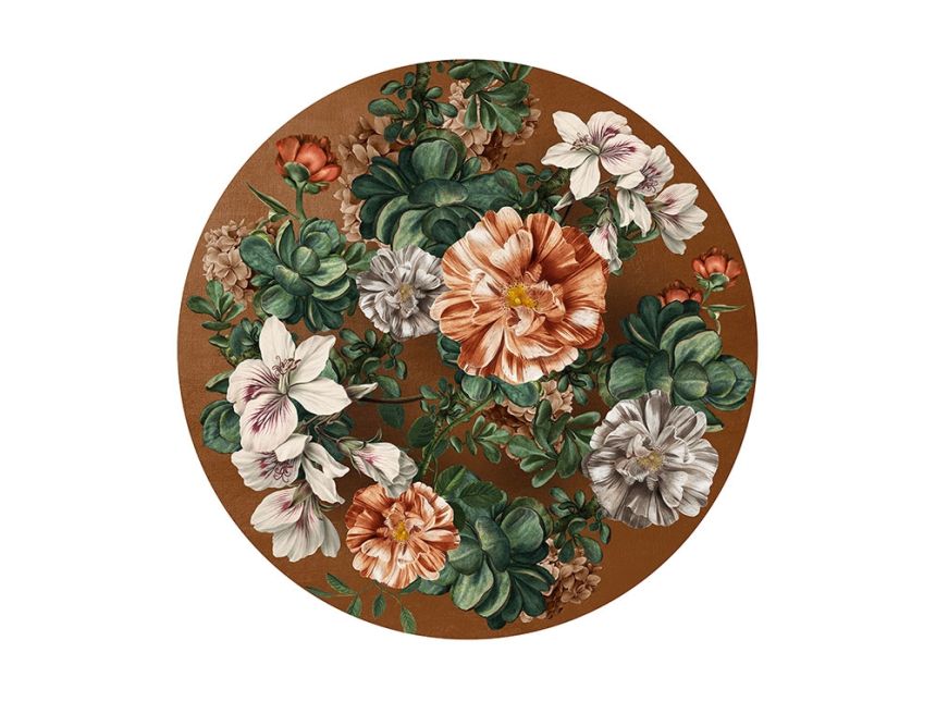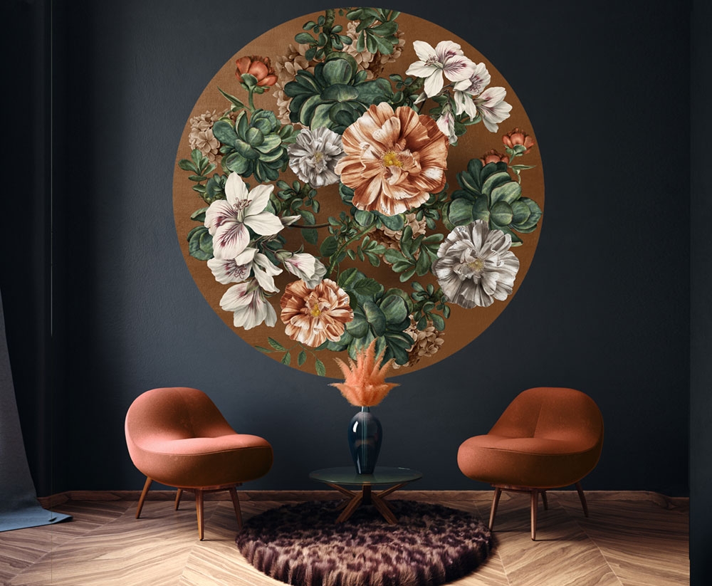 Vliesová, kruhová tapeta s květy na hnědém podkladu.