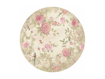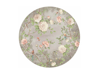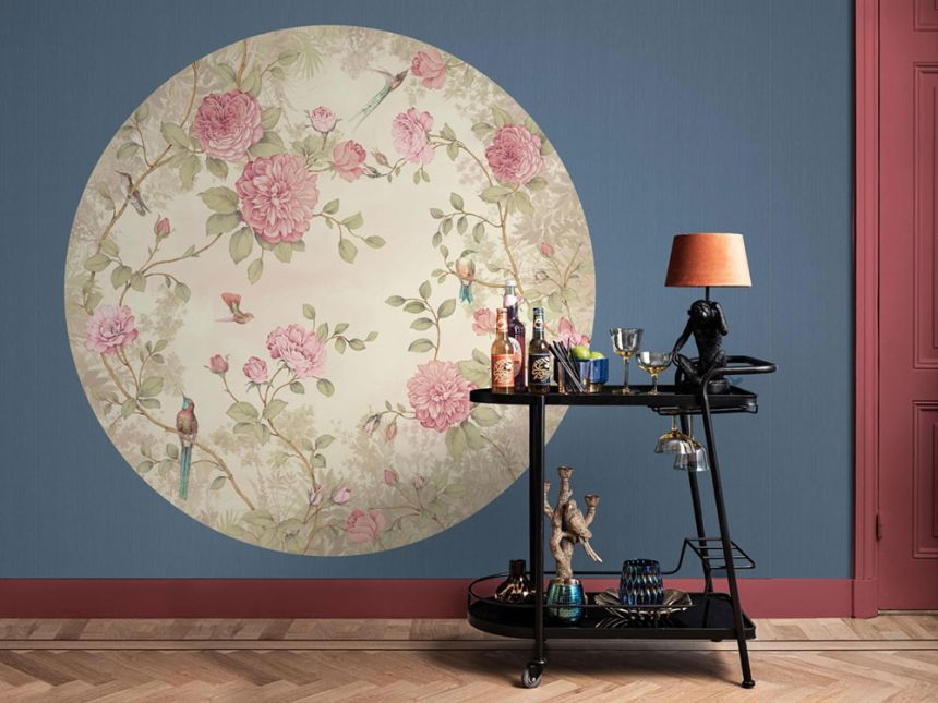 Vliesová, kruhová tapeta se stonky růží a ptáky v jemných pastelových odstínech.