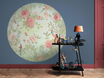 Vliesová, kruhová tapeta se stonky růží a ptáky na pastelovém modro-zeleném podkladu.