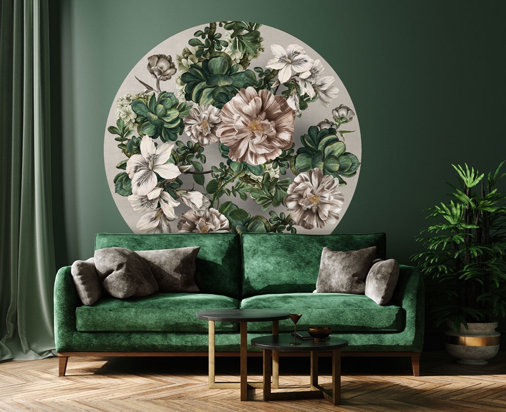 Vliesová, kruhová tapeta s květy na šedo-béžovém podkladu.