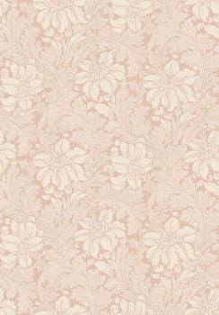 Vliesová tapeta na zeď, květinový vzor v béžových odstínech na růžovém pozadí, zobrazuje listové a květinové detaily - podle návrhu ze 40. let 19. století.