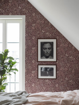 Vliesová tapeta na zeď, motiv květin, plodů a listů v odstínech vínové a růžové, drobné zlaté detaily, inspirováno návrhem z 50. let 20. století.