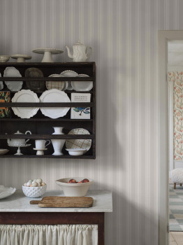Vliesová tapeta na zeď, klasický proužkový vzor v odstínech smetanově bílé a šedé.