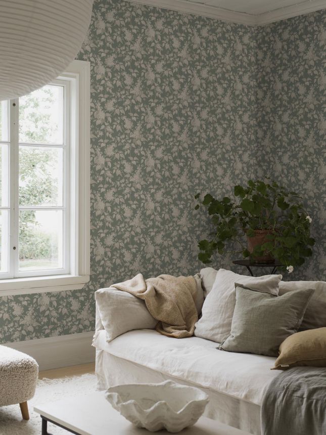 Vliesová tapeta na zeď, zelený podklad, vzor šeříkových větviček a růží v odstínech šedo-bílé.