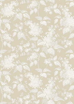 Vliesová tapeta na zeď, světle béžový podklad, vzor šeříkových větviček a růží v odstínech šedo-bílé.