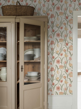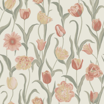 Vliesová tapeta na zeď, krémový podklad, květiny, tulipány v odstínech zelené, růžové a meruňkové.