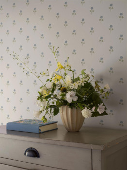 Vliesová tapeta na zeď, podklad bílý, sasanky v odstínech zelené a modré.