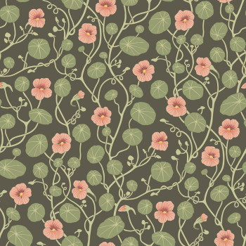 Vliesová tapeta na zeď, podklad zelený, vzor rozkvetlé lichořeřišnice v odstínech růžové a zelené.