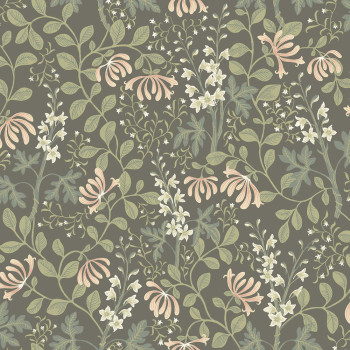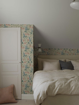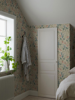 Vliesová tapeta na zeď, podklad béžový, květinový vzor v odstínech zelené, modré a růžové.