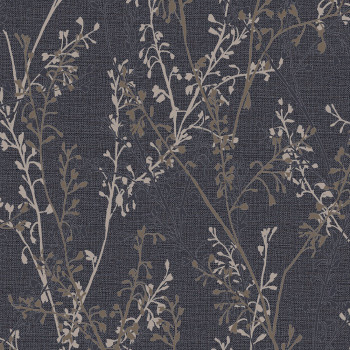 Vliesová tapeta na zeď, tmavě modrá látková textura, prolisované větvičky v hnědé, modré a stříbrné.