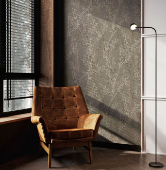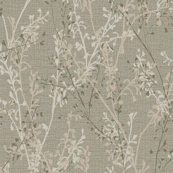 Vliesová tapeta na zeď, hnědo-béžová látková textura, prolisované větvičky v šedé, béžové a zlato-béžové.