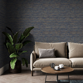 Vliesová tapeta na zeď, tmavě modrý podklad, látková textura, flíčky v odstínech zlaté, modré a hnědé.