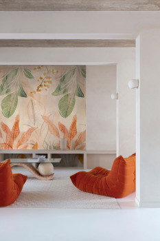 Vliesová fototapeta s vinylovým povrchem, motiv listů v odstínech zelené, okrová, oranžová, růžová, terakota.