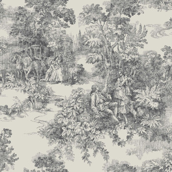Vliesová tapeta na zeď, černý tisk na světlém šedo-béžovém podkladu - romantický motiv inspirovaný historickými látkami Toile de Jouy.