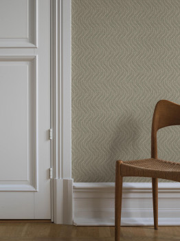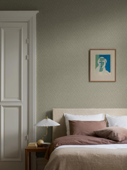 Jemně plastická vliesová tapeta na zeď, vzor stylizovaných listů kapradin v odstínech zelené.