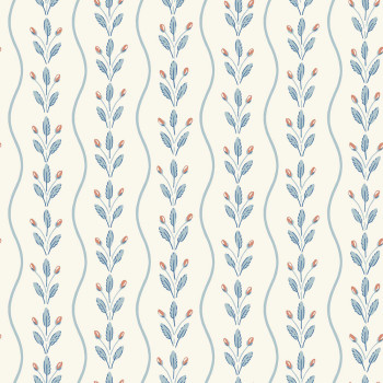 Vliesová tapeta na zeď, smetanově bílý podklad, modré vlnkové linie tvoří pruhy; vzor listů a červených plodů.