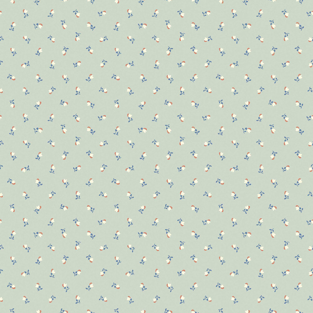 Vliesová tapeta na zeď, zelený podklad, motiv drobných kytiček v odstínech modré, červené a bílé.