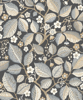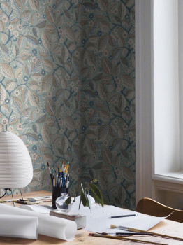 Vliesová tapeta na zeď, šedo-modrý podklad, rozkvelté větvičky v odstínech modré, hnědé, růžové a krémové.