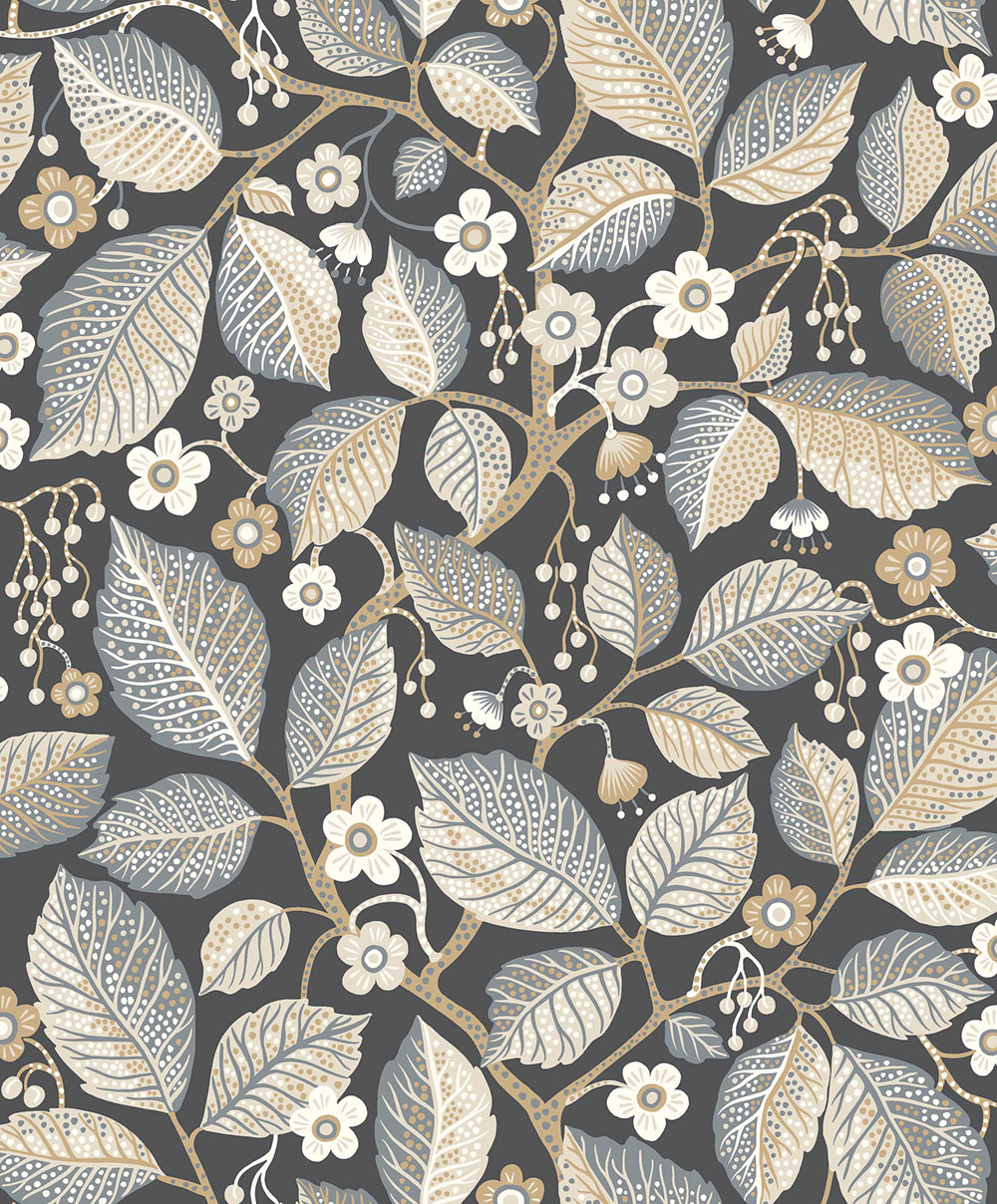 Vliesová tapeta na zeď, černý podklad, rozkvelté větvičky v odstínech hnědé, šedé a béžové.