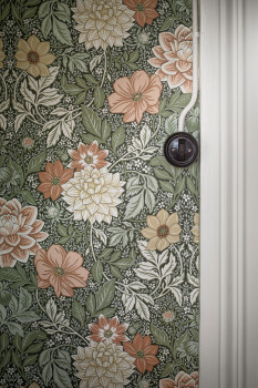 Vliesová tapeta na zeď, bohatý květinový vzor v odstínech zelené, béžové a růžové.