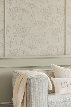 Vliesová tapeta na zeď, vzor rozkvetlých lučních travin v odstínech světle šedo-zelené a bílé - plastická textura.