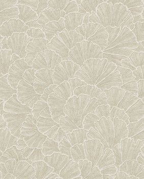 Vliesová tapeta na zeď, vzor listů Gingka v odstínech šedo-béžové / pískové, jemná textura.