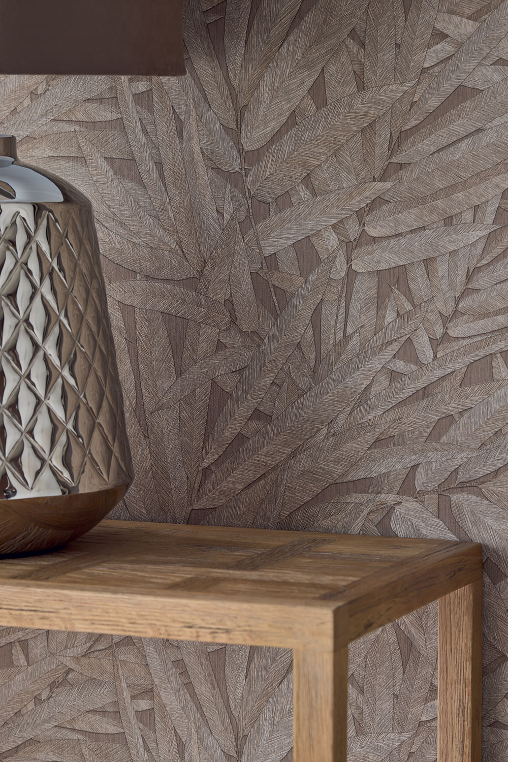Vliesová tapeta na zeď, vzor listů v odstínech hnědé, jemně plastický podklad.