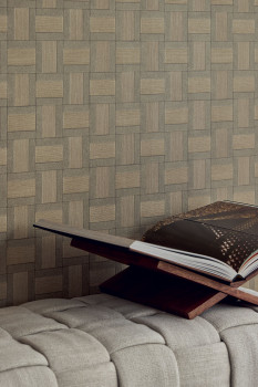 Vliesová tapeta na zeď, imitace efektního přírodní čtvercového obložení, jemná textura, odstíny zelené, šedo-zelené.