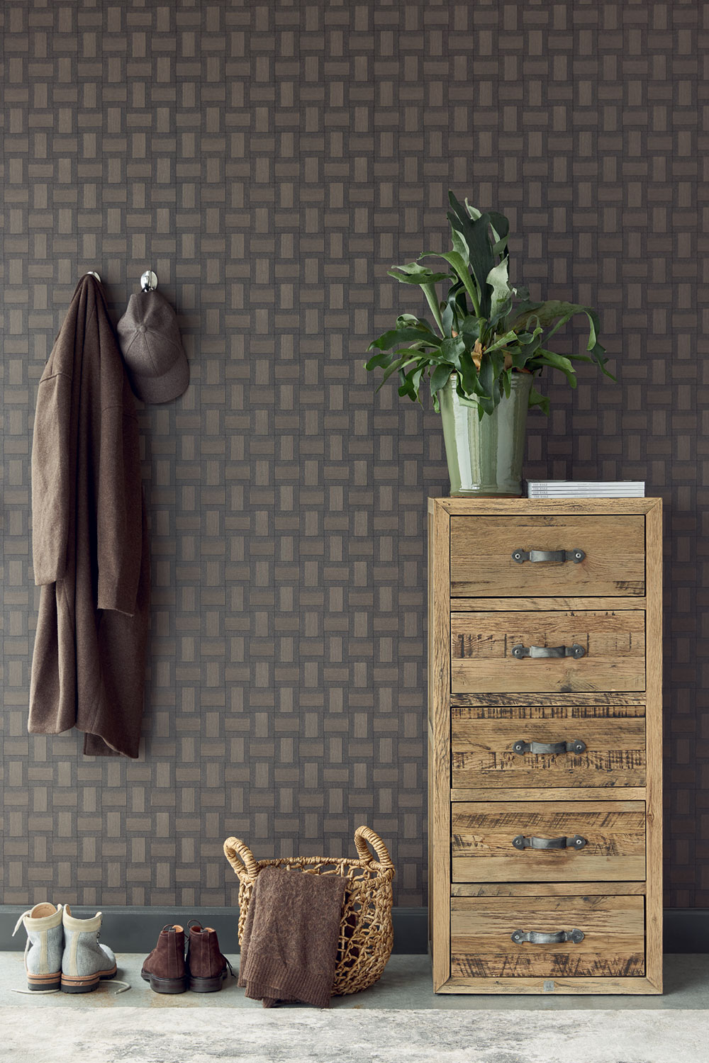 Vliesová tapeta na zeď, imitace efektního přírodní čtvercového obložení, jemná textura, odstíny tmavě hnědé.