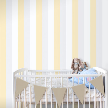 Současné trendy nadčasovým pruhům a proužkům přejí. Jsou kombinovatelné se vzorovými i jednobarevnými tapetami, nebo samostatně dokáží vymezit a zútulnit prostor. Dětská pruhovaná bílo-šedo-žlutá papírová tapeta na zeď.