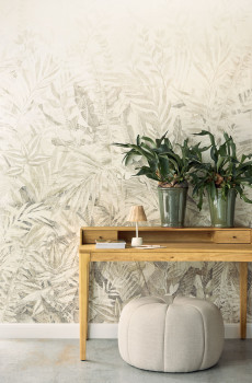 Vliesová obrazová tapeta na zeď, vzor listů v odstínech šedo-zelené.