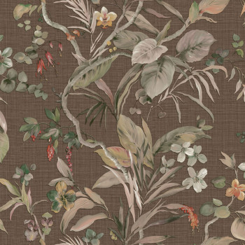 Luxusní vliesová tapeta s vinylovým povrchem, podklad hrubší hnědo-zlatá látková textura, pololesklý bohatý květinový vzor.