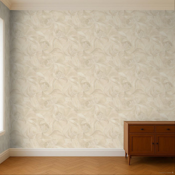 Vliesová tapeta s vinylovým povrchem, odstíny světle béžové a šedo-béžové, perlové pololesklé detaily, plastické stylizované květiny.