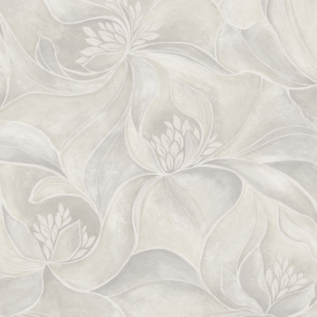Vliesová tapeta s vinylovým povrchem, odstíny šedé, stříbrné pololesklé detaily, plastické stylizované květiny.