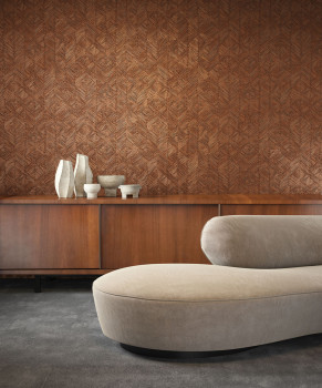 Vliesová tapeta na zeď, plastické linie tvoří geometrické vzory, odstíny hnědé / terakota a pololesklé měděné.