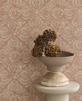 Vliesová tapeta s vinylovým povrchem, hrubší textura, odstíny starorůžové a béžové, design ornamentálních tisků.