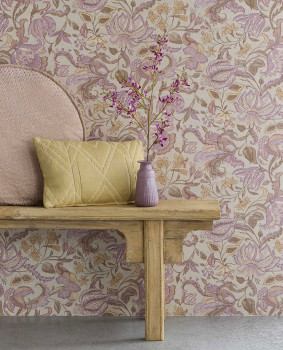 Luxusní vliesová tapeta s vinylovým povrchem, béžový podklad s textilní strukturou, ornamentální květinový vzor v odstínech hnědé, fialové, starorůžové a okrové.