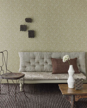 Vliesová tapeta na zeď, jemně plastický ornamentální květinový vzor, odstíny zelené / khaki.
