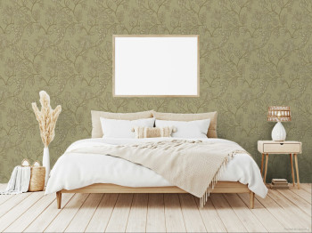 Vliesová tapeta na zeď, textilní struktura, ornamentální květinový vzor v odstínech hnědé, béžové.