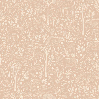 Vliesová tapeta na zeď, vzor lesních zvířátek, stromů a rostlin, odstíny růžové, vzhled a struktura látky.