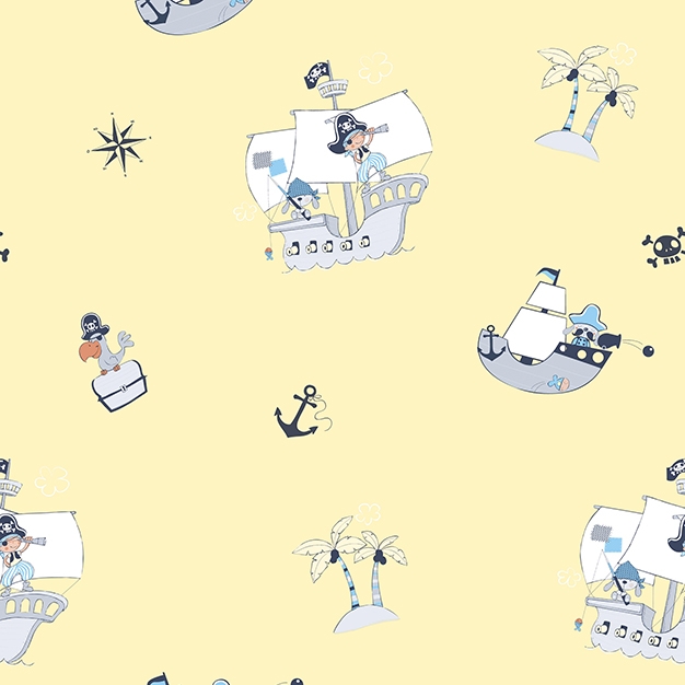 Změňte strohé stěny a vytvořte útulný pokojíček, ve kterém se vaše děti budou cítit dobře. Tapeta pro nejmenší děti - piráti na světle žluté papírové tapetě na zeď.