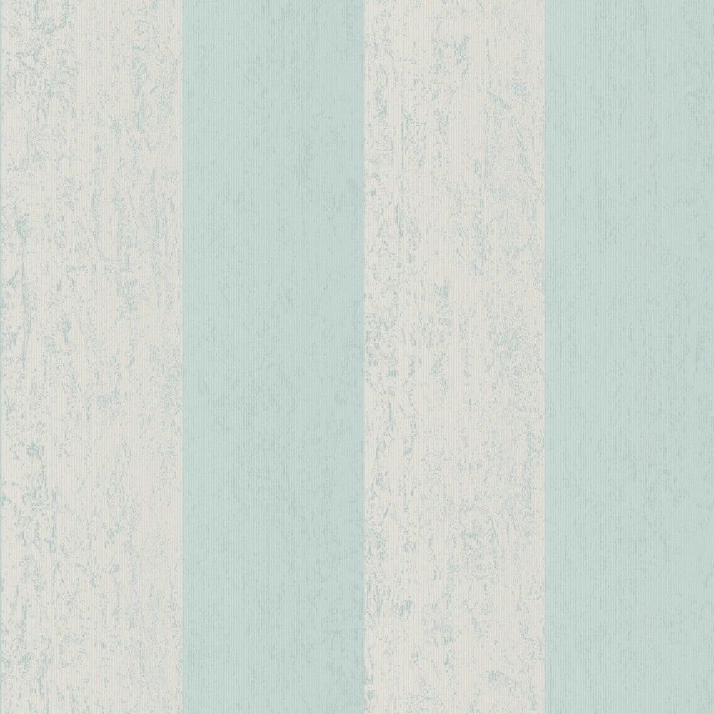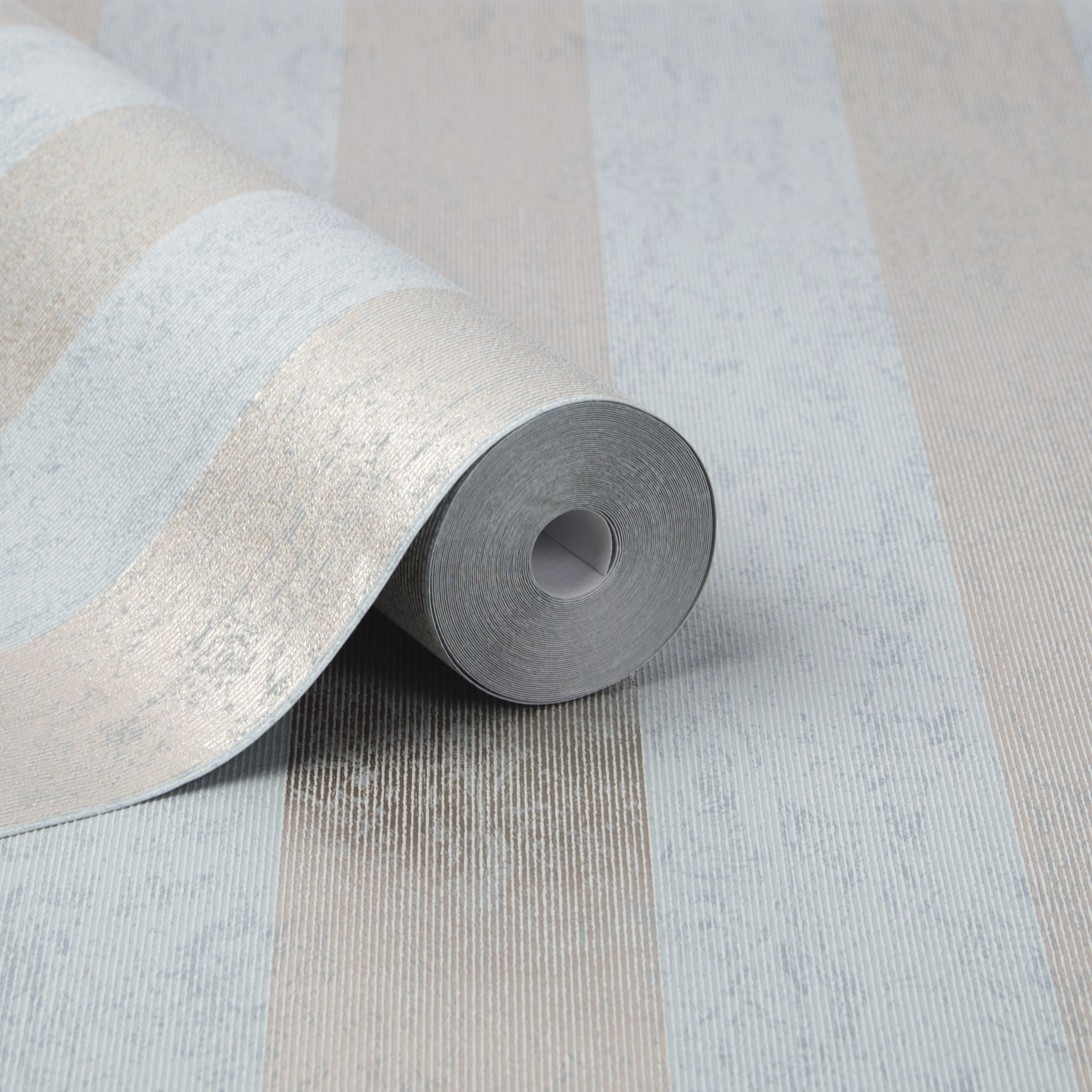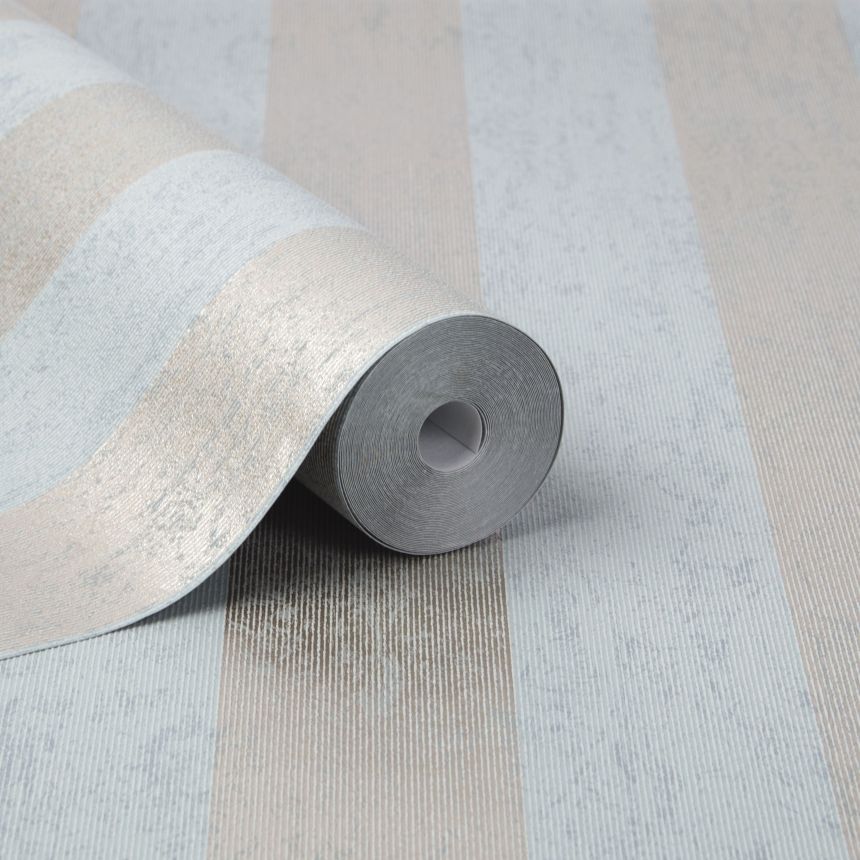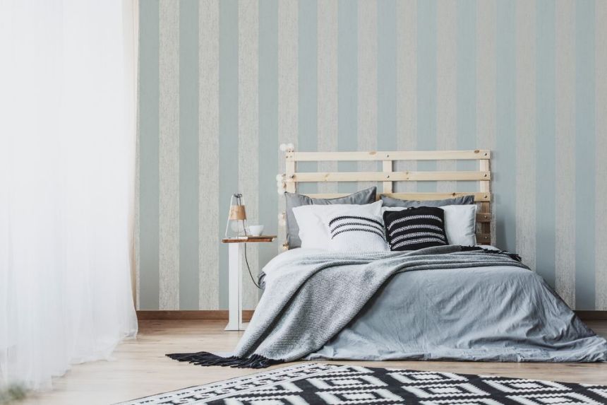 Vliesová tapeta na zeď, pruhzy v odstínech modré a pololesklé béžové.