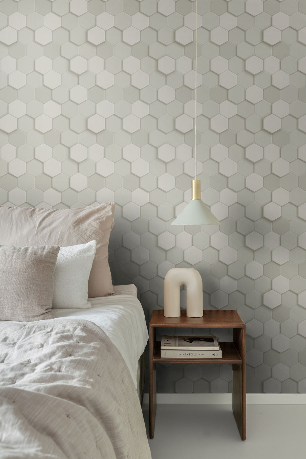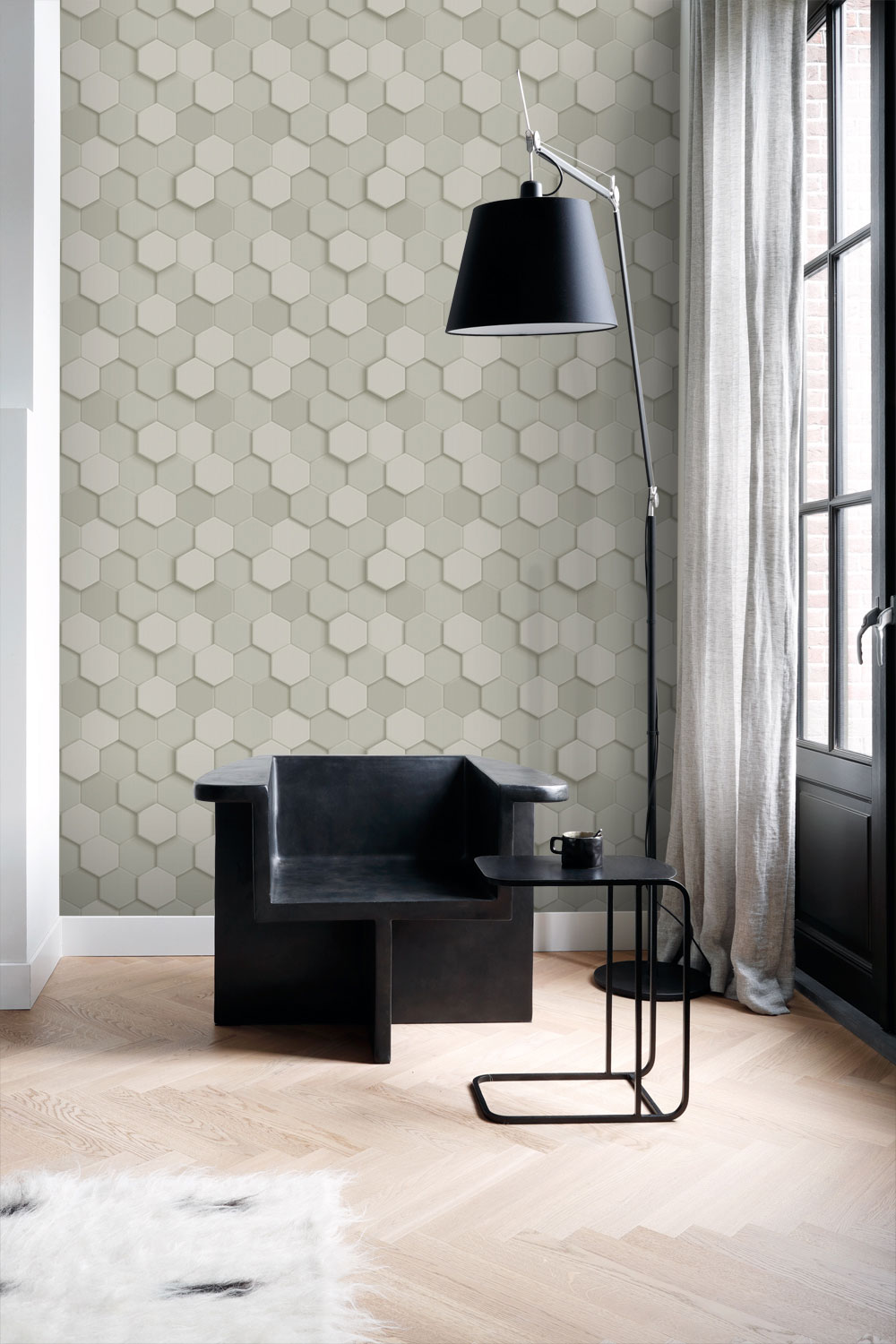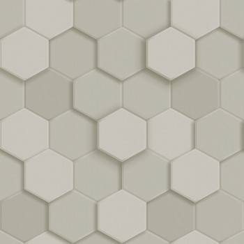 Vliesová tapeta na zeď, s 3D motivem včelí plástve / hexagonů ve světle šedých odstínech.