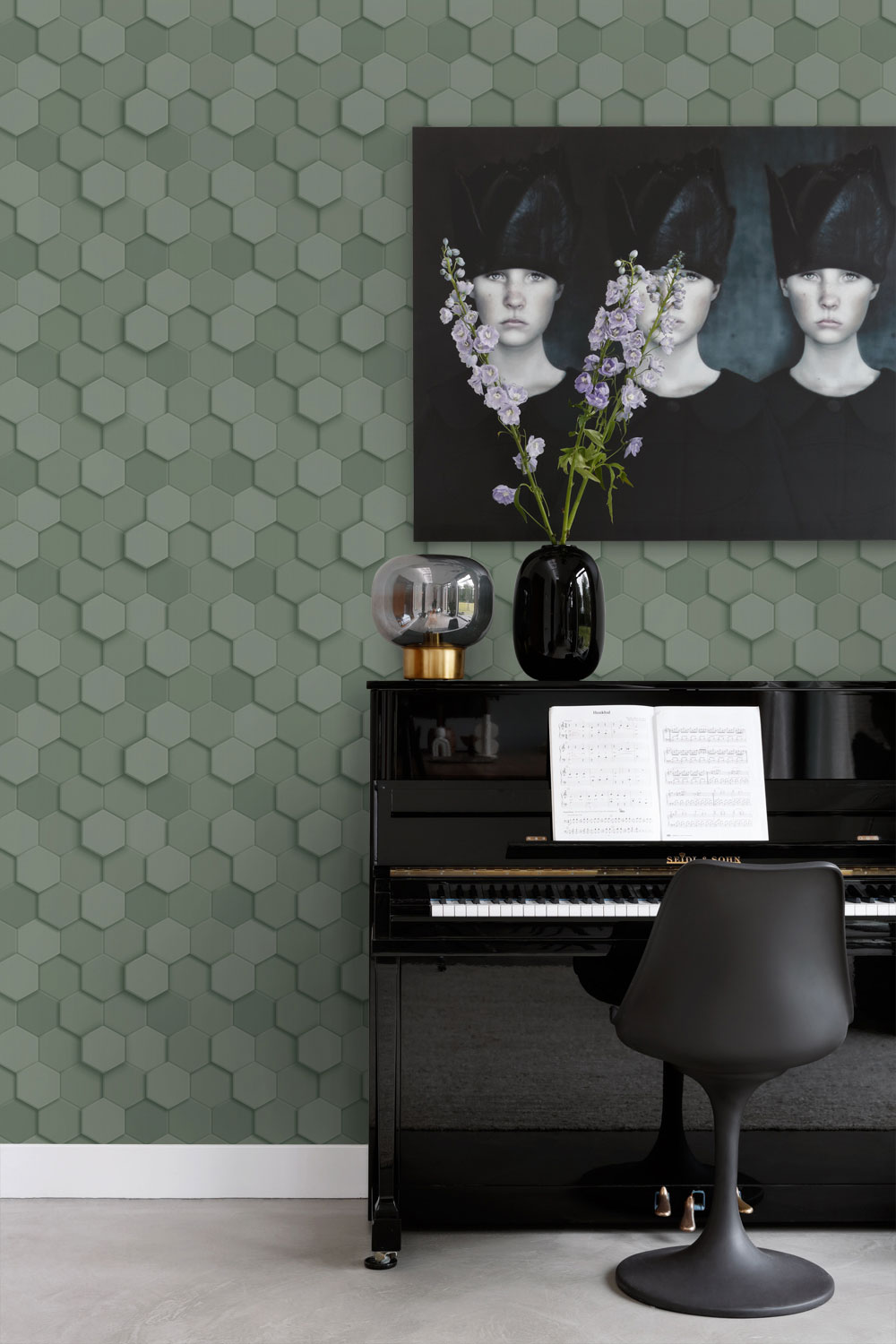 Vliesová tapeta na zeď, s 3D motivem včelí plástve / hexagonů v šalvějově zelených odstínech.